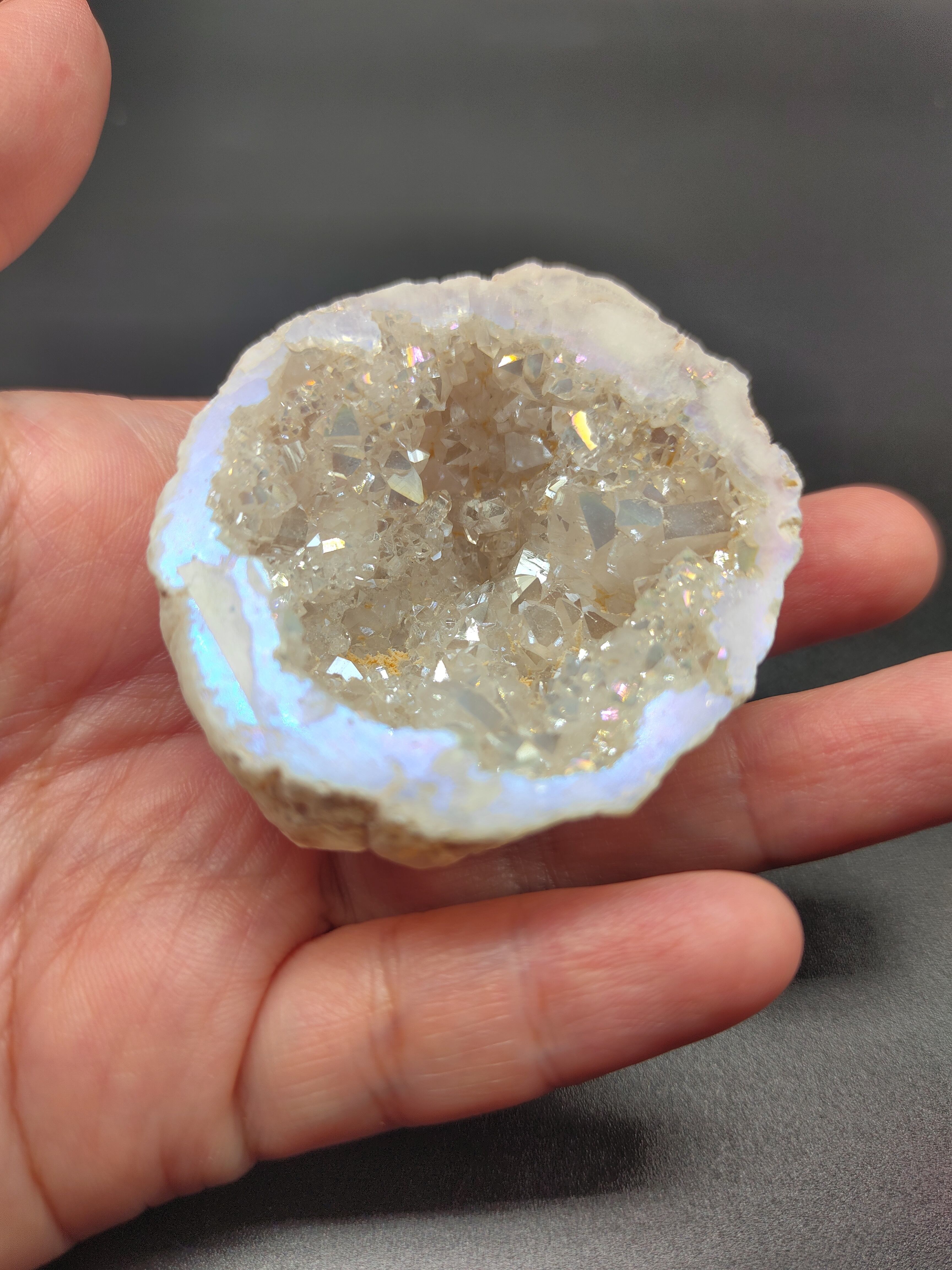 オーロラ水晶ジオードとは、純金やチタンを蒸着と言う特別技法でジオード(晶洞)へ吹き付けることによって、虹のような七色の輝きを放つ特別な加工したものです。オーロラクリスタル系は、どれも浄化力が高く、強いエネルギーを持つとされています。
