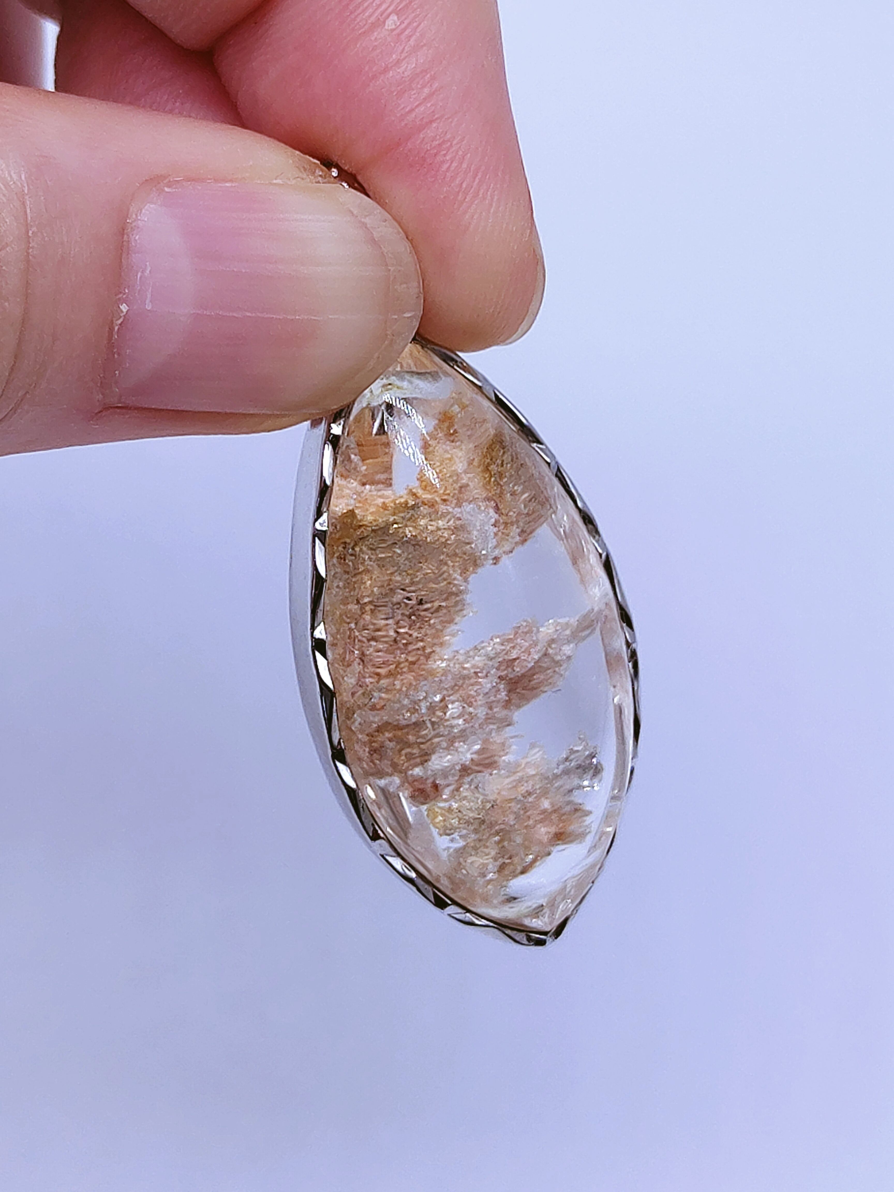 希少なホワイトガーデンクォーツが、美しいペンダントトップになりました。内包物がこんなにスッキリ綺麗な模様で出るのは珍しく、クリアな水晶の奥に神秘的な世界が広がり、グッと引き込まれました。