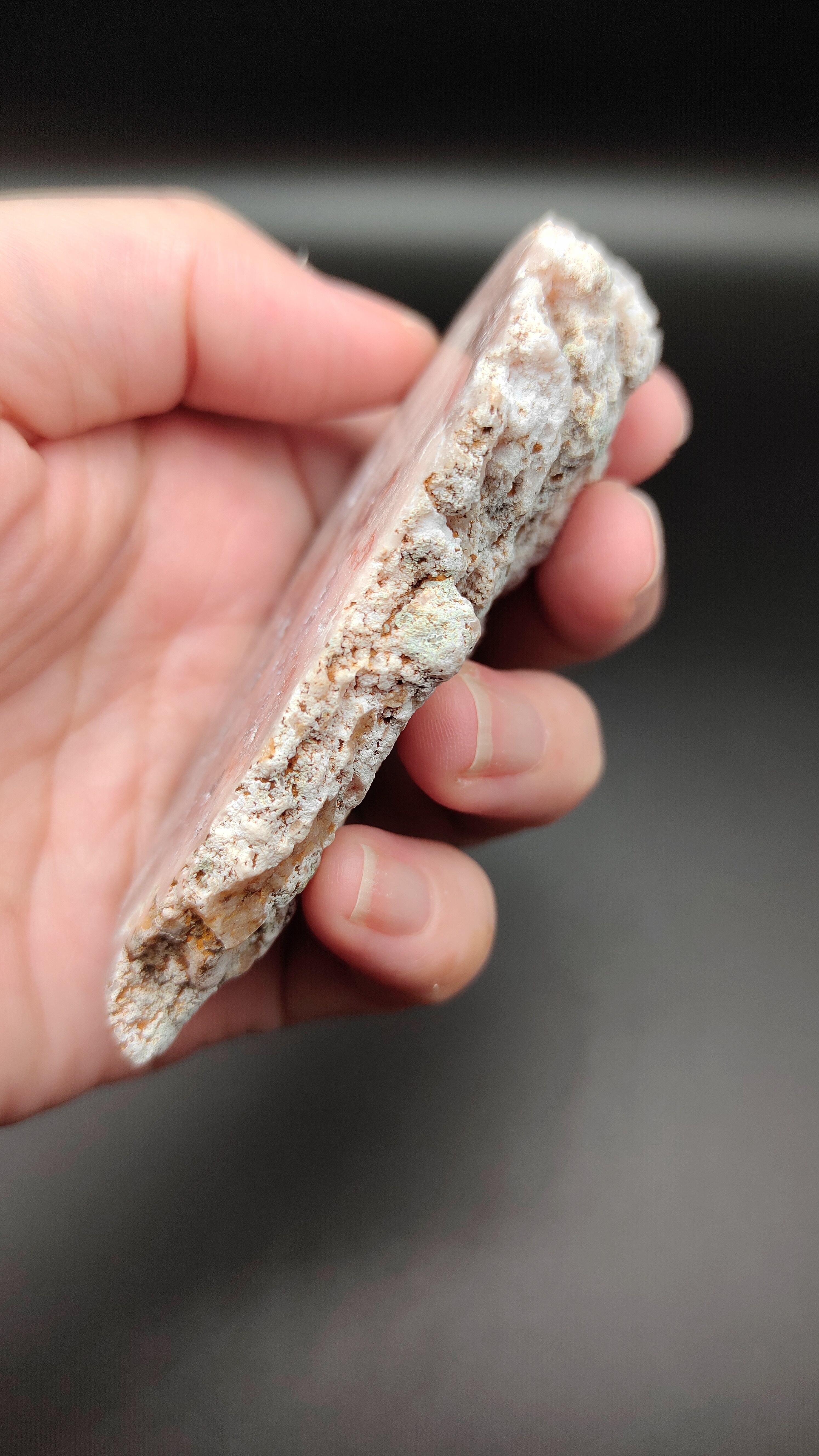 ピンクアメジストは流通量が少ないレアストーンです。こちらは、エネルギーの高いままの原石をスライスし研磨したものになります。淡いピンクのグラデーションに、クリアな結晶が煌めき神秘的です。