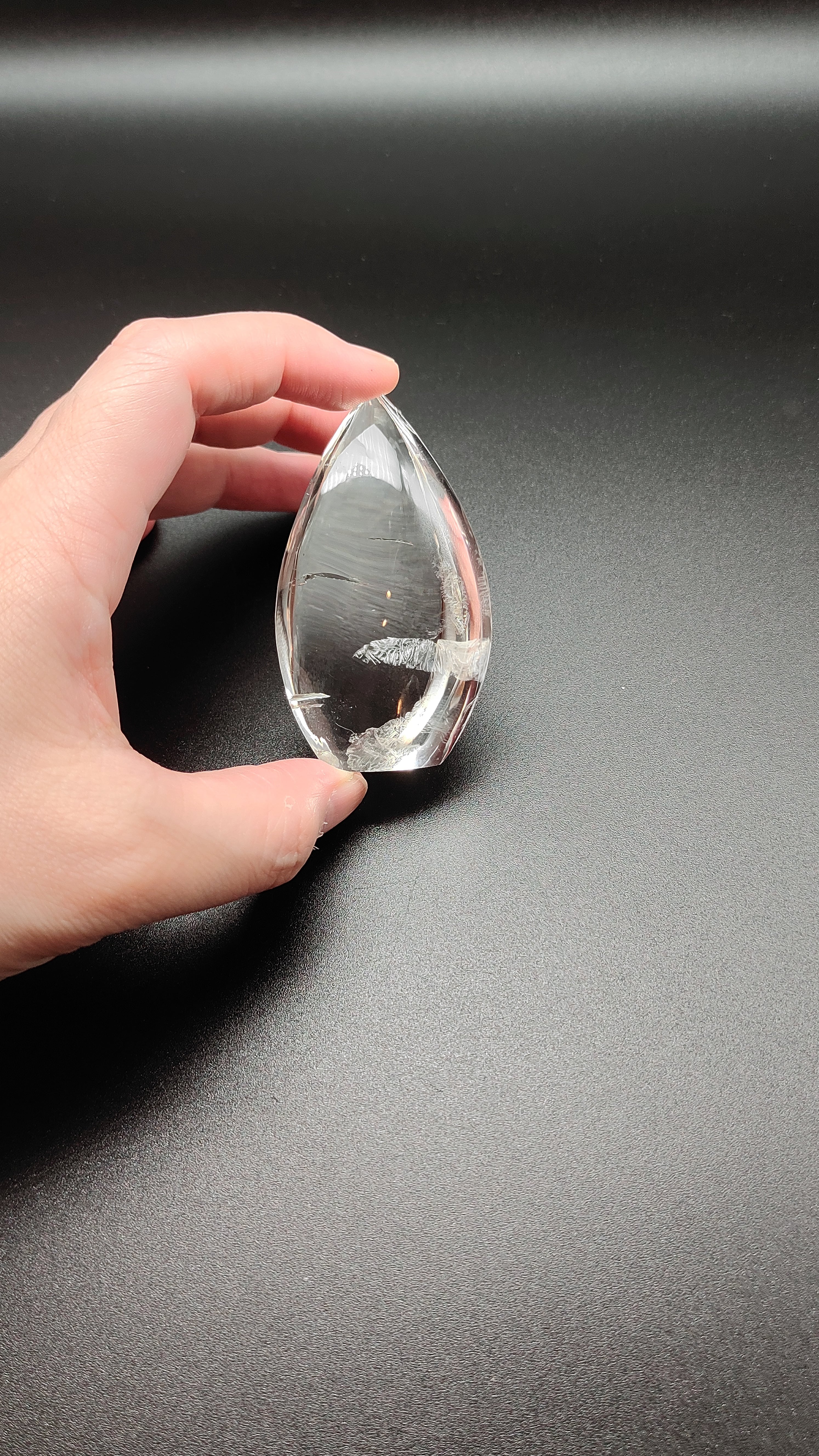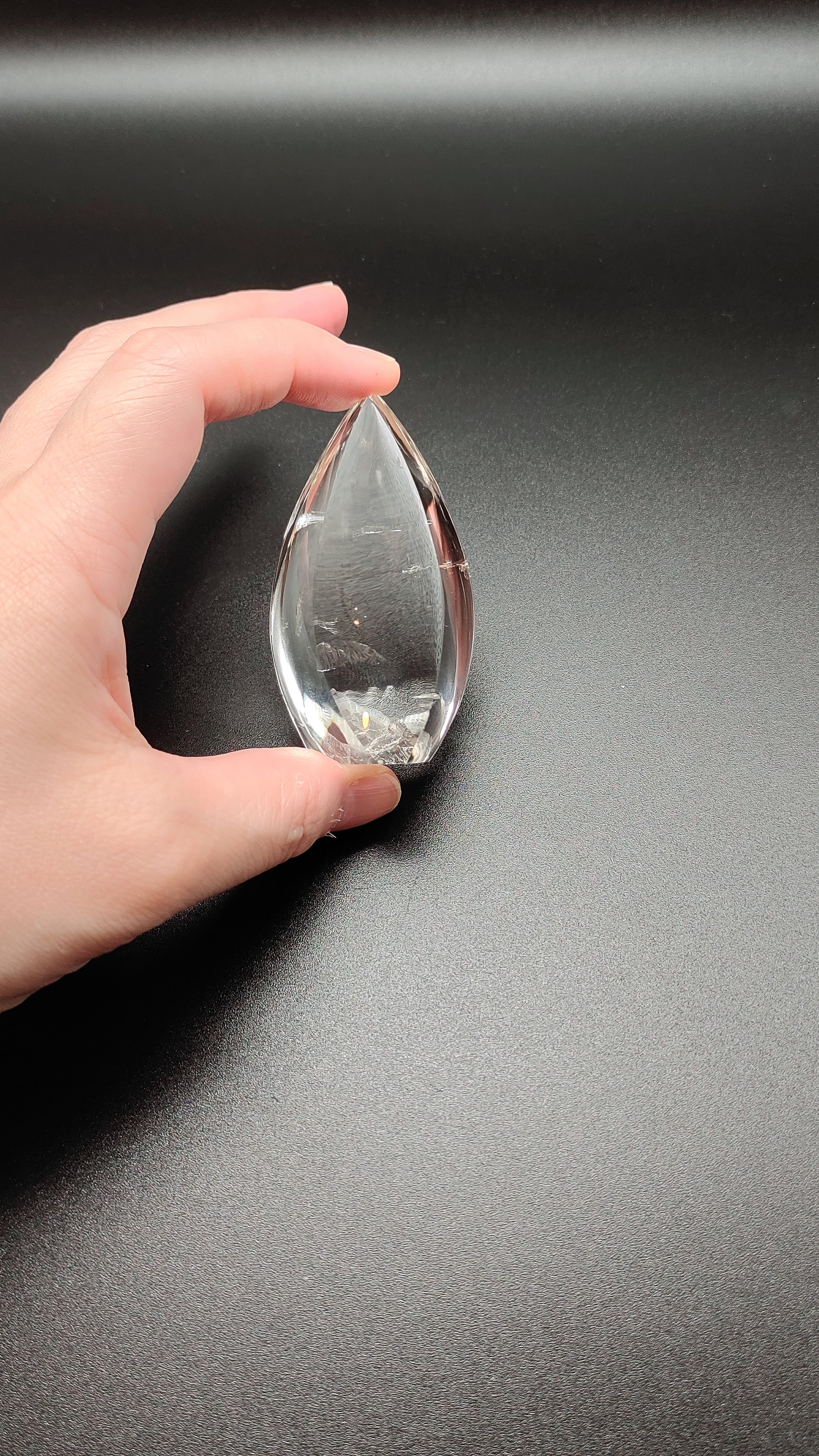 ブラジル産のレムリアンシードクリスタルを研磨した雫型のポイント(背面がフラットな変形五角錐・画像参照下さい)になります。女性らしい柔らかいカーブを描いて研磨されており、大変純粋で気品のある水晶です。インテリアとしてもお使いいただけます。