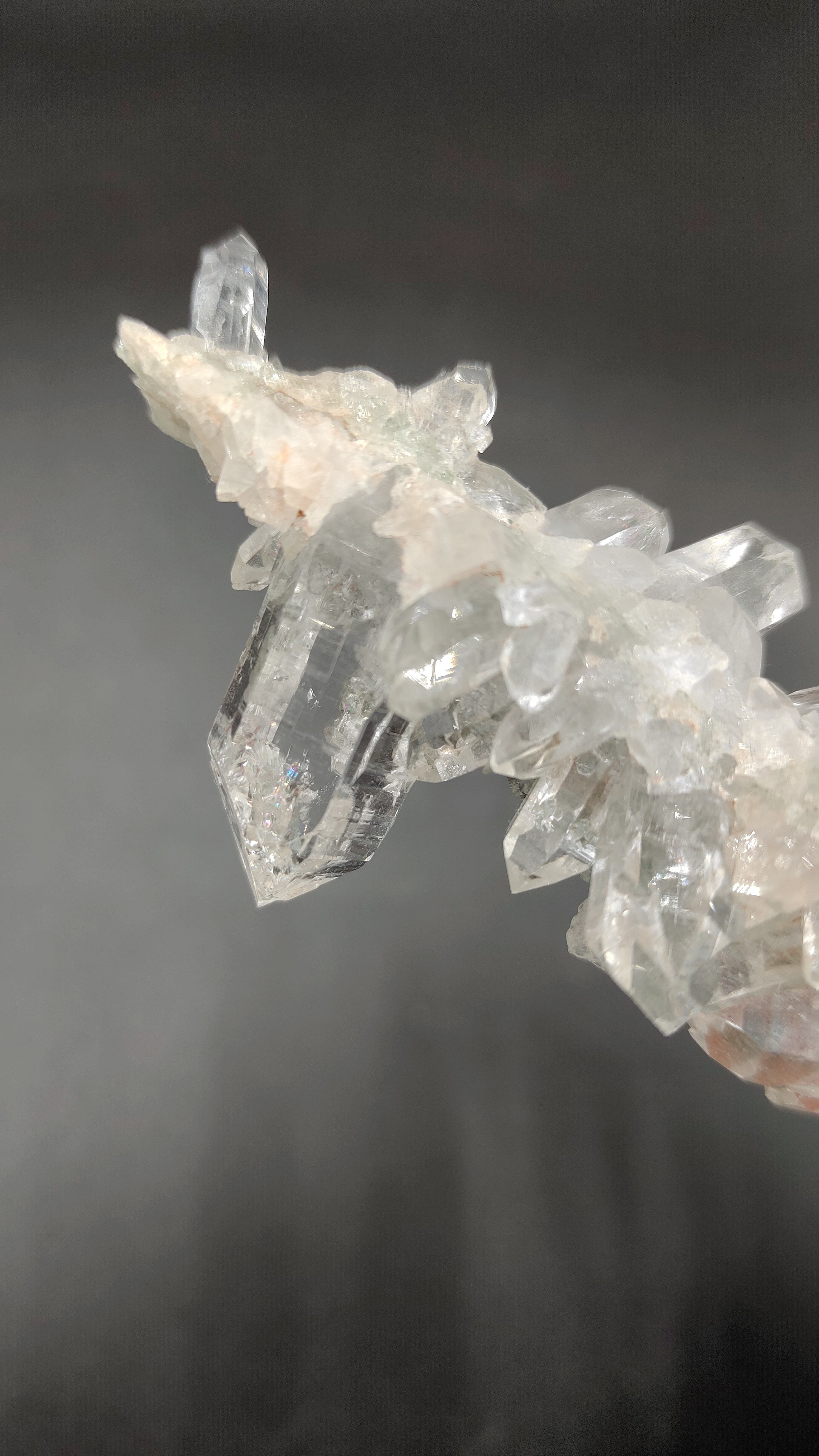 また、ガネーシュヒマール水晶の特徴としては、クローライト(緑泥石)を含有し濃い緑色をした小さな結晶の集積や、小枝状に鋭利に伸びたクラスター、不浄物がないため透明度がとても高く、力強いヒマラヤの浄化パワーがあることです。非常に個性的で、シャープさと凛とした存在感を兼ね備え、どれとも比べ様のない美しさを感じます。