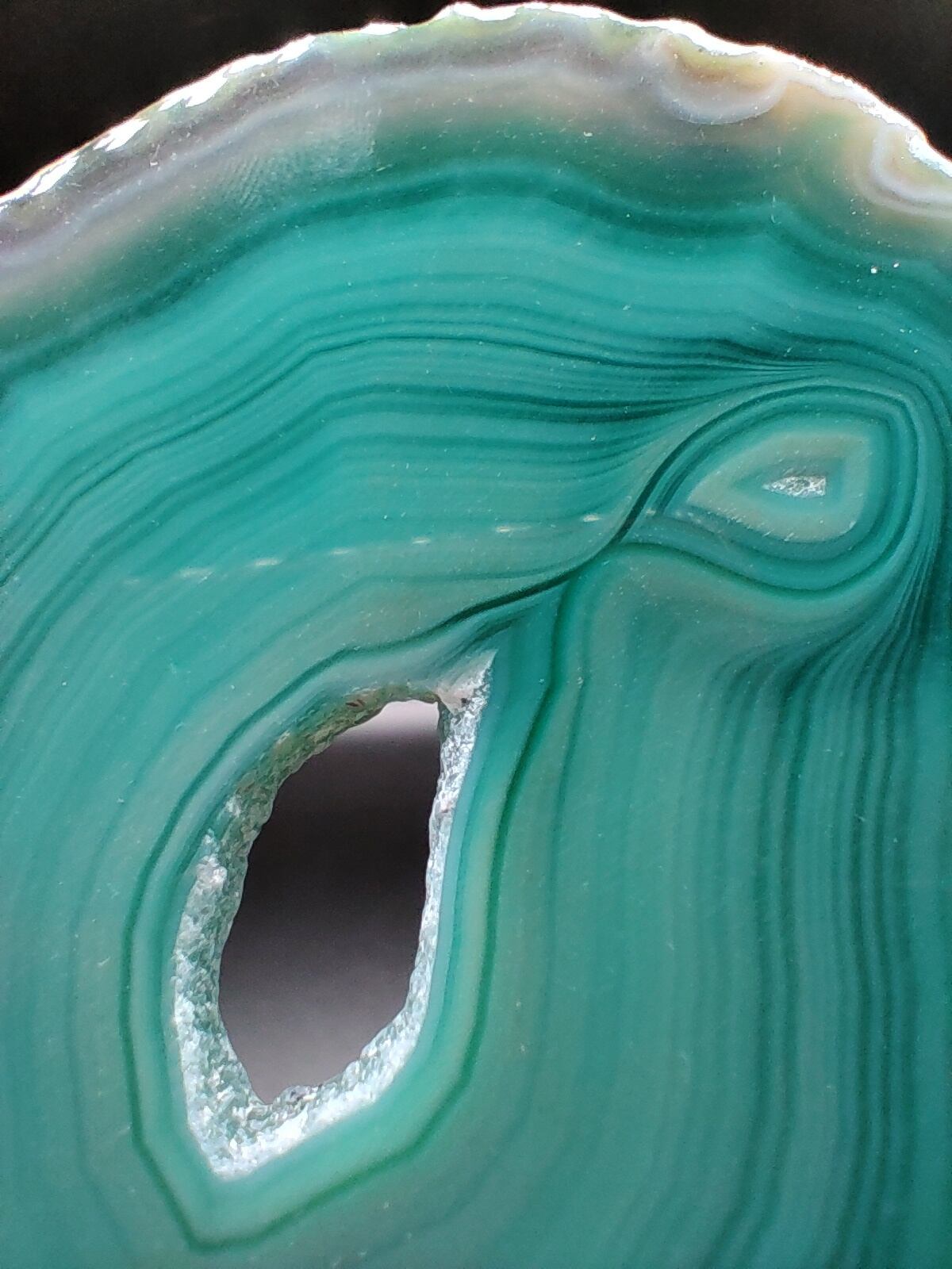 エメラルドグリーンのグラデーションがとても美しい天然瑪瑙(メノウ<アゲート>)スライスです。中央には財運幸福を呼び込むと言われる龍穴が見られ、それを取り巻く緑はまさに「青龍と宝珠」の様です。