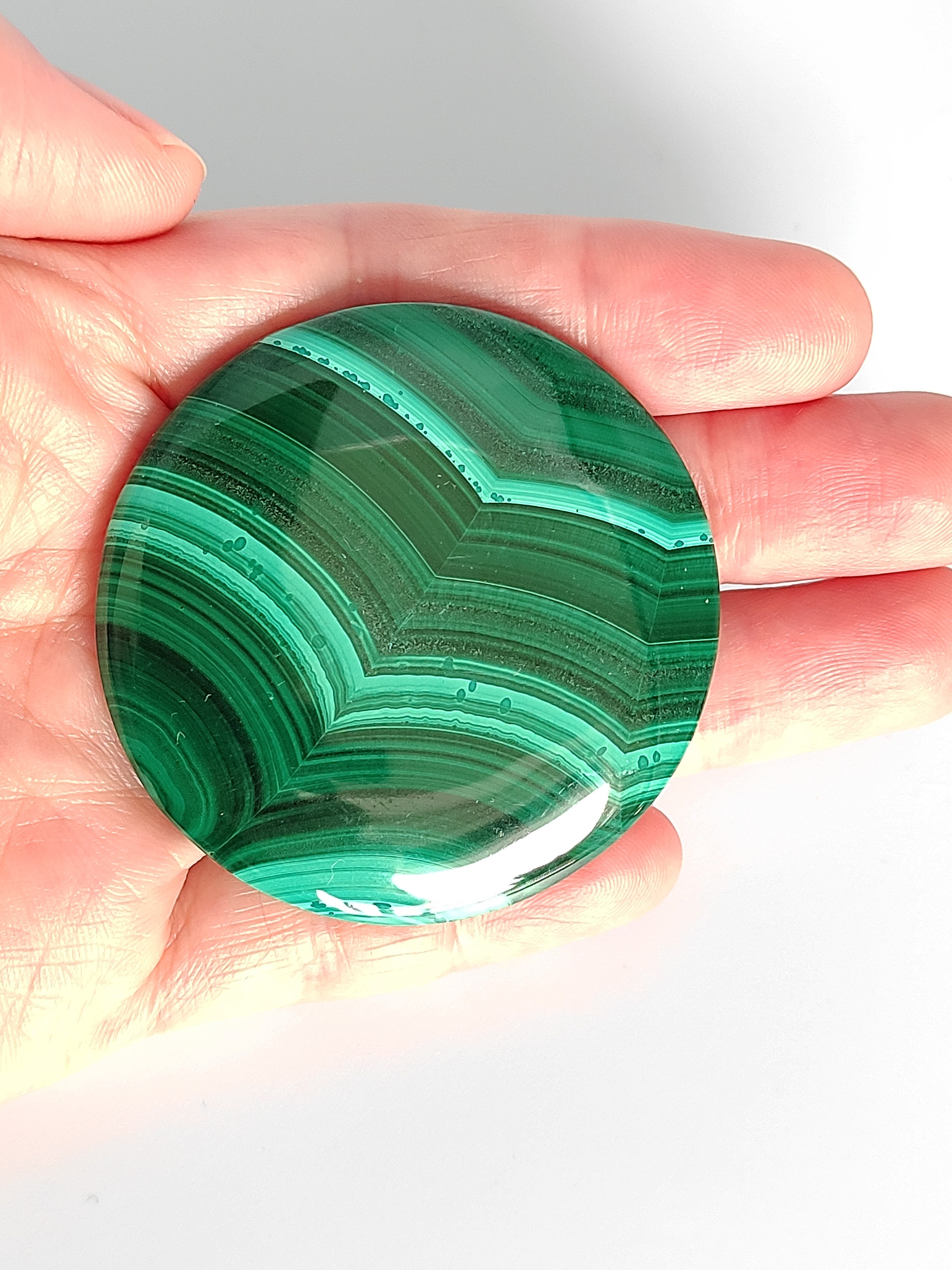 持ってすぐに、オフィスでPCを前にデスクワークの女性が、傍らにこのマラカイトを置いているイメージが浮かびました。目や頭の疲れ、呼吸が浅くなっている、多くの人の邪気がある職場で使用されると良いですよ、というメッセージです。仕事の合間に握って頂いたり、目を休めるために眺めているだけで効果ありです。もちろんご自宅でもお使いください。世話のかかる、観葉植物代わりにおススメです。