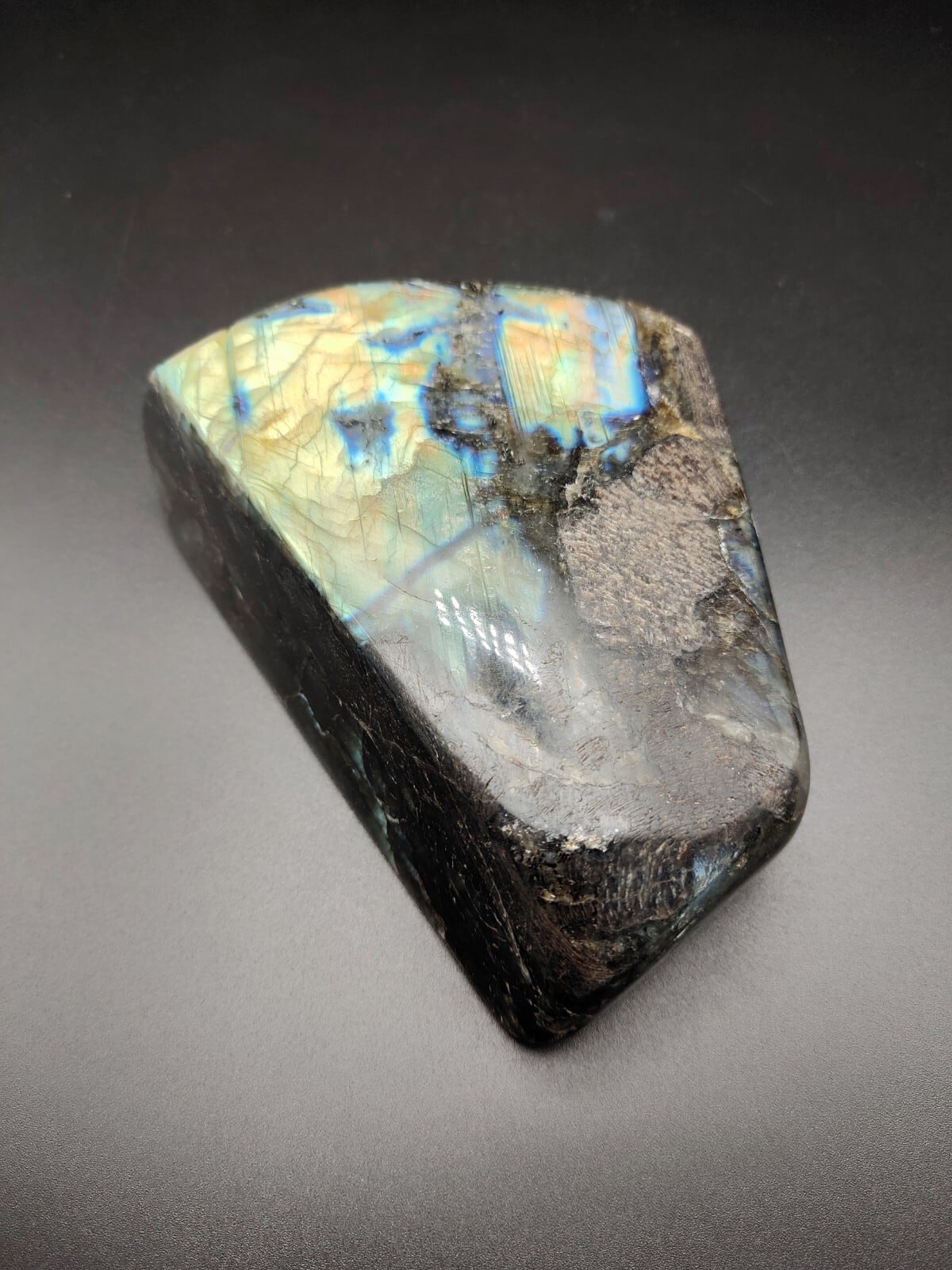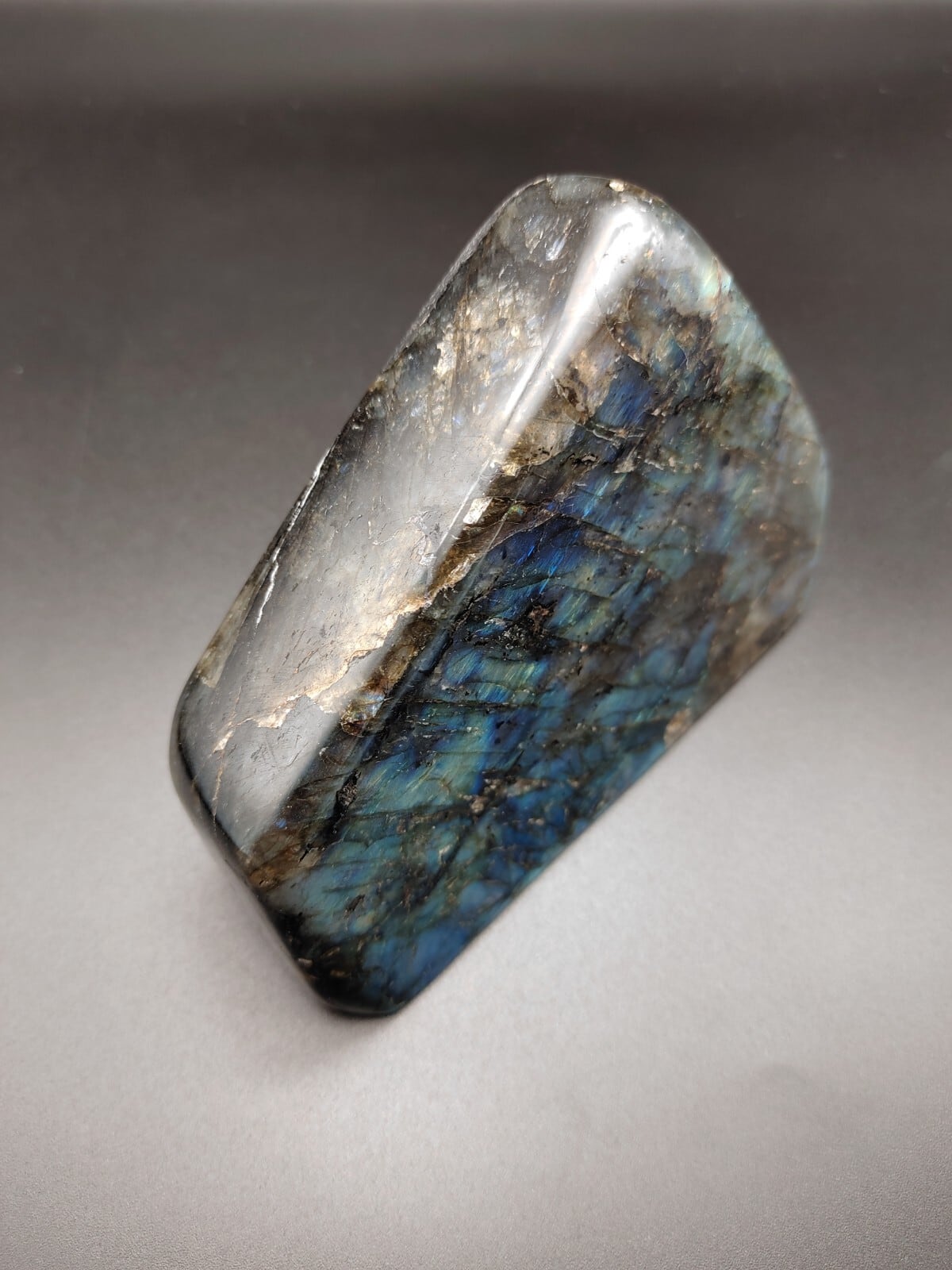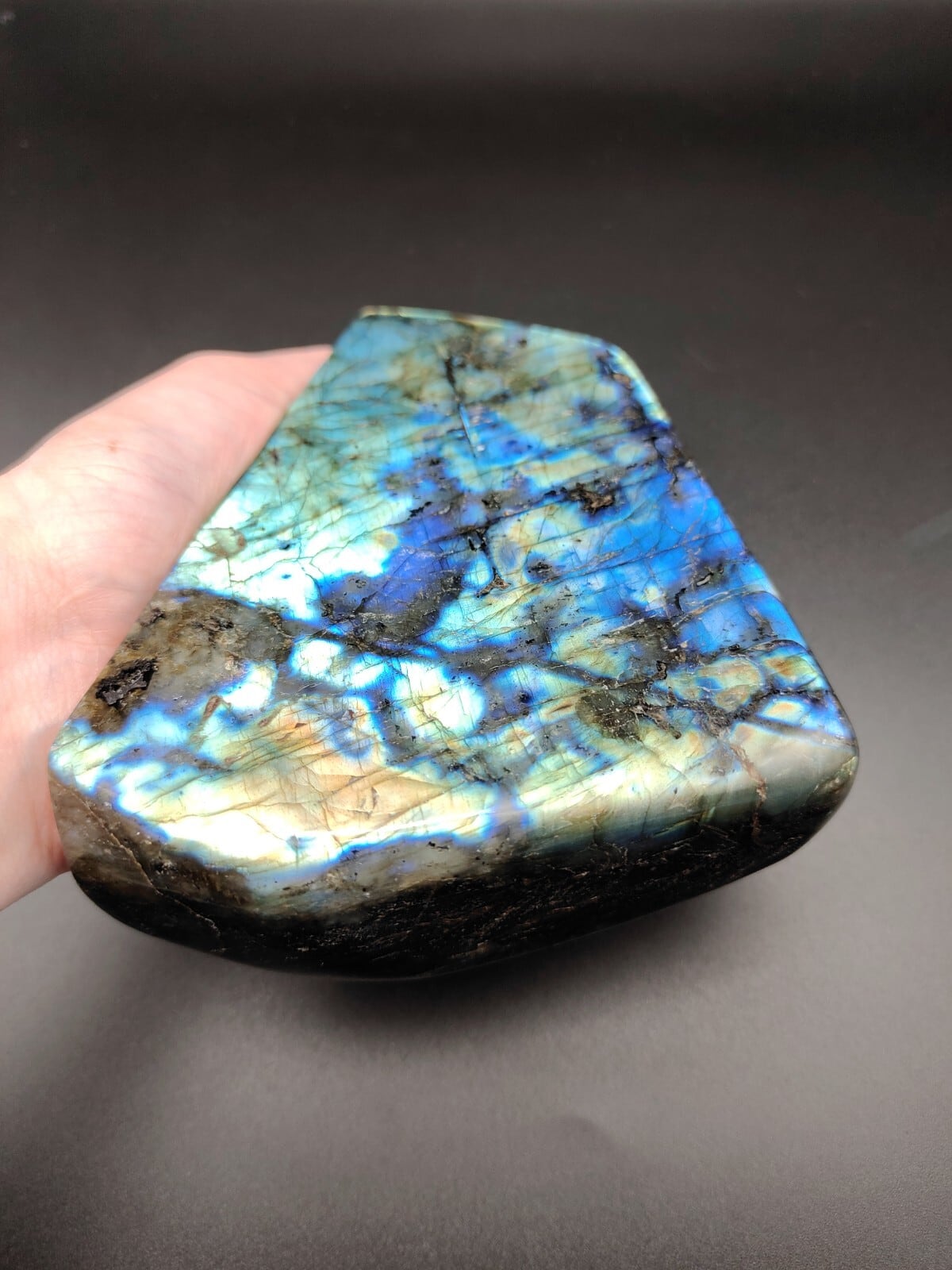 こちらのラブラドライトは、ずっしり重厚感があり、ずっと眺めていたくなるような神秘的な存在感が魅力です。お部屋をパワースポットにしたいときにも最適です。