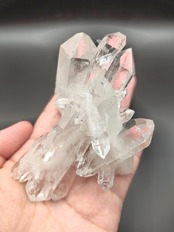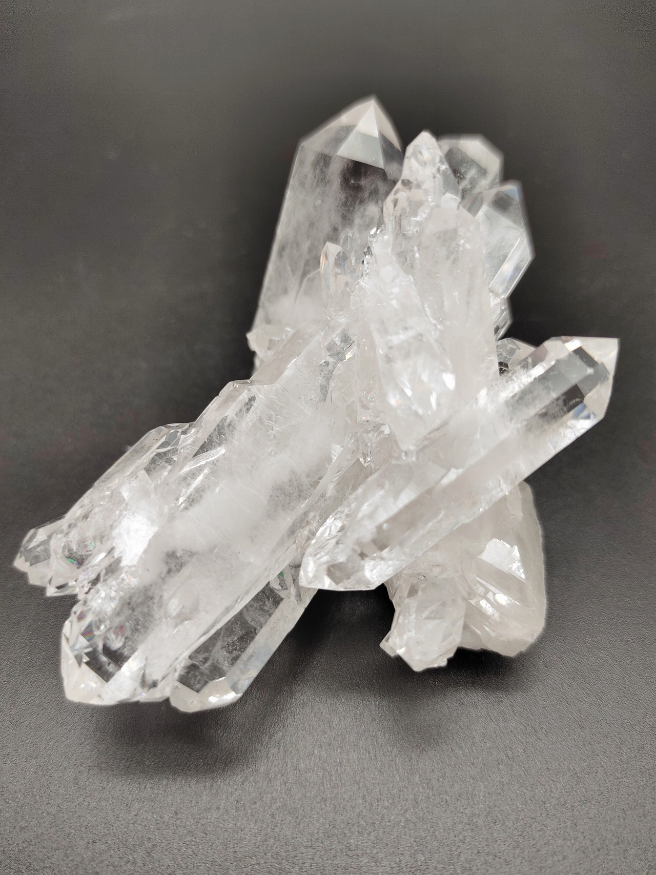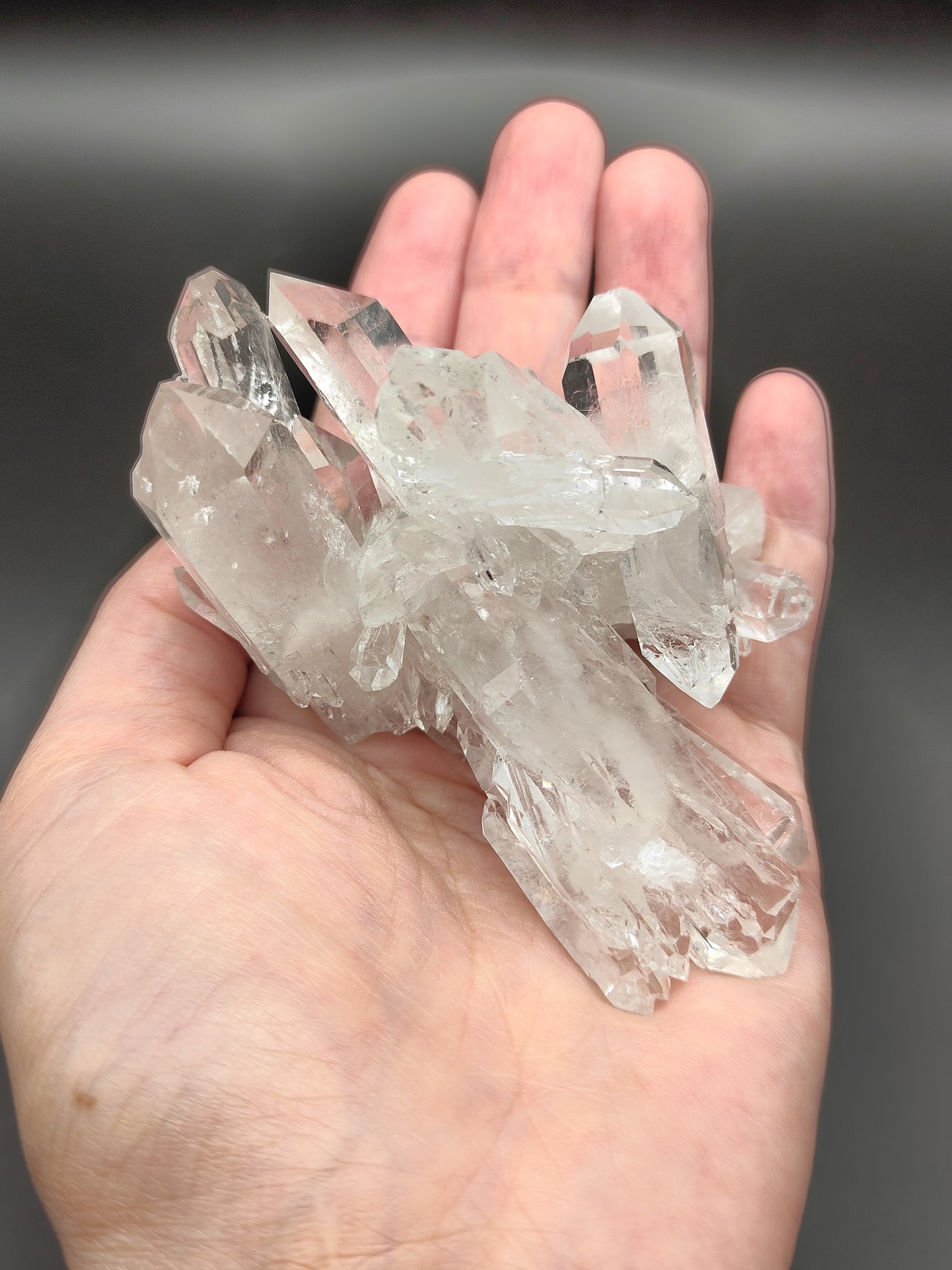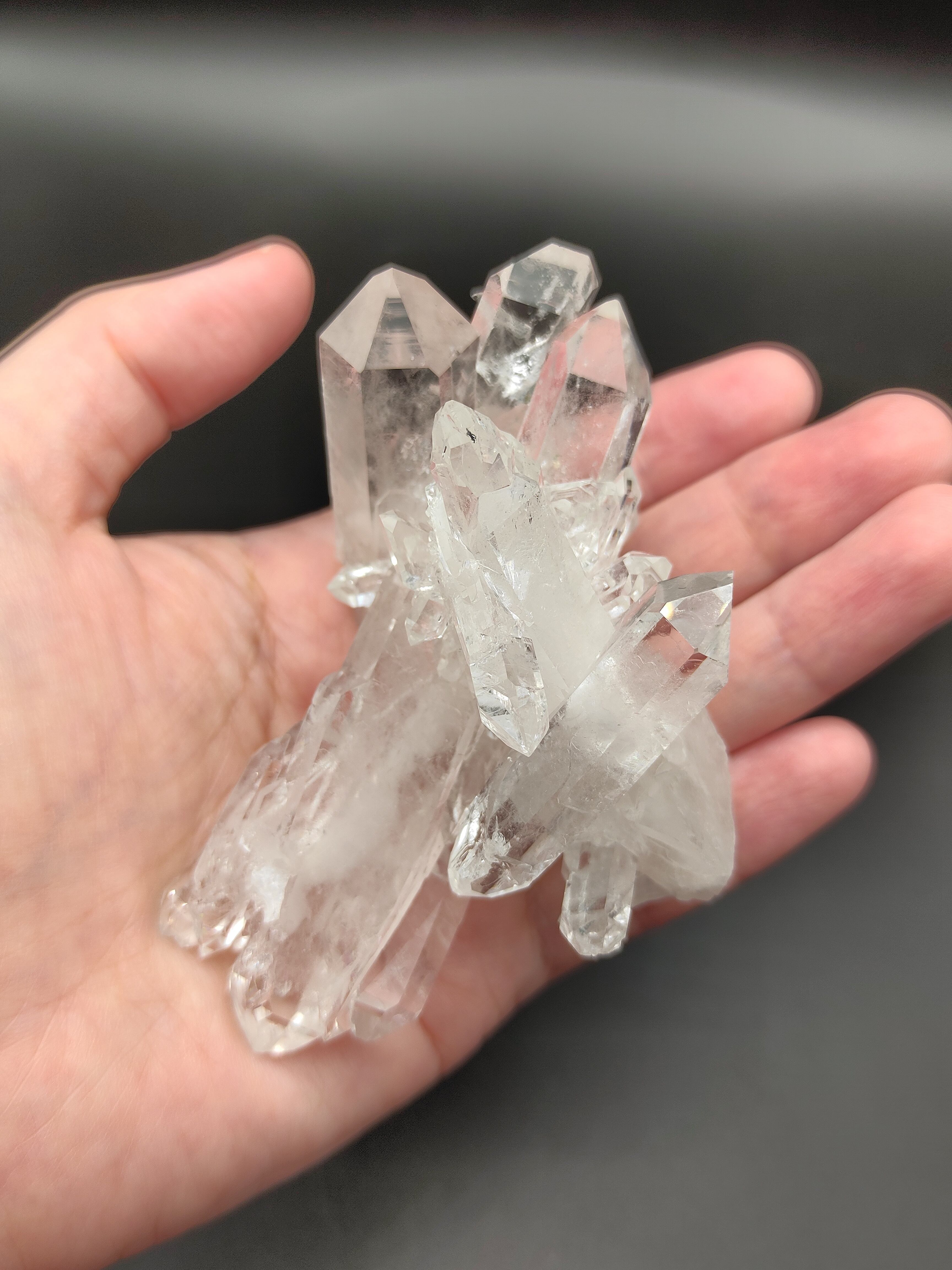 水晶ビッグクラスターは、大きな結晶が幾重にも重なるようにできた水晶クラスターです。手のひらサイズなのに、どっしりとした存在感が魅力的。いくつもの小さな天然のレインボーが輝く美しいクラスターで、浄化のエネルギーが豊富に含まれています。
