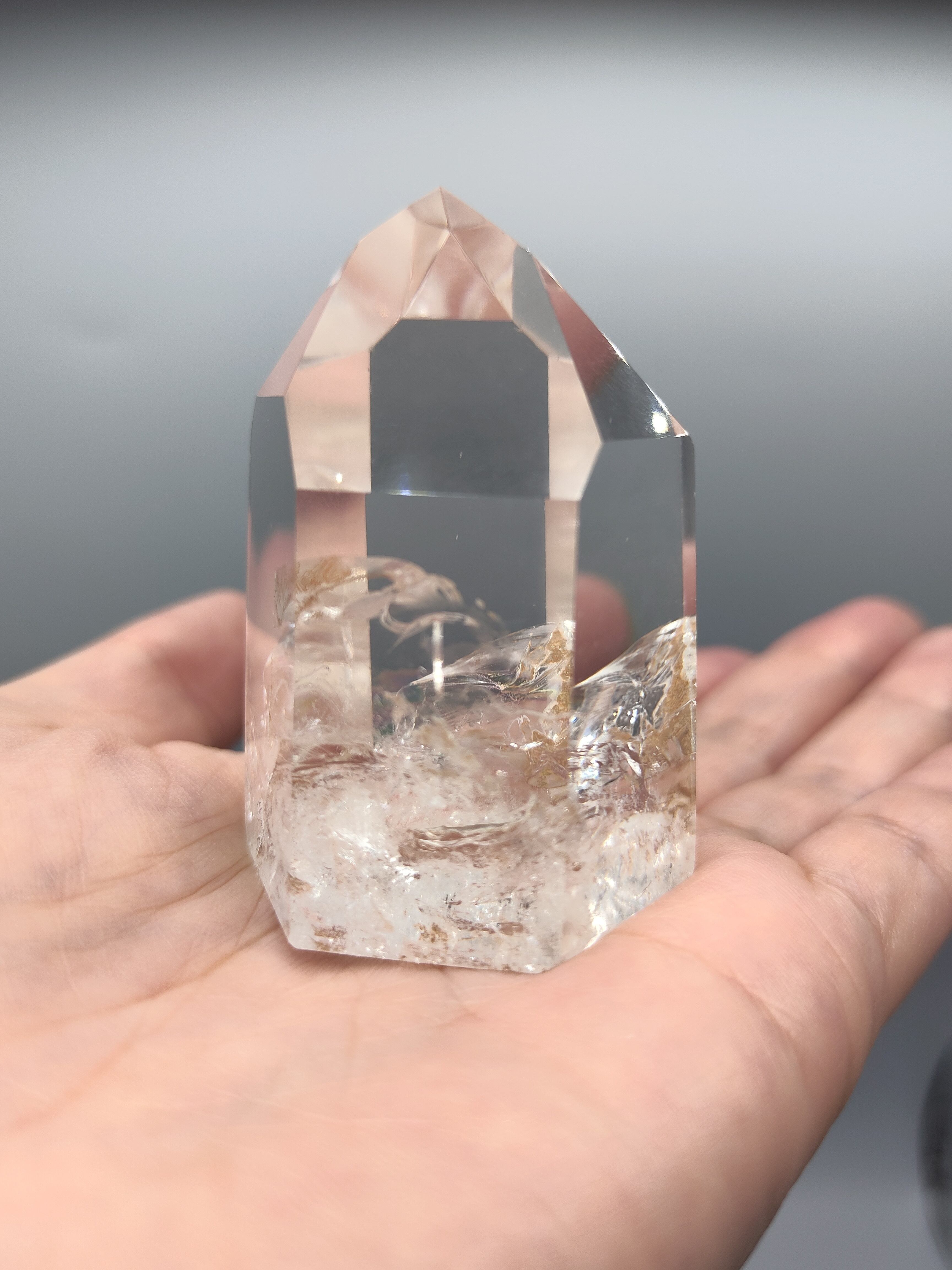ブラジル産のレムリアンシードクオーツポイントです。レムリアン水晶は、高い波動を持つとても繊細な石です。こちらは、クリスタルの透明感が引き立つように研磨されていて、幸運を運ぶといわれる天然のレインボーを眺めることができます。