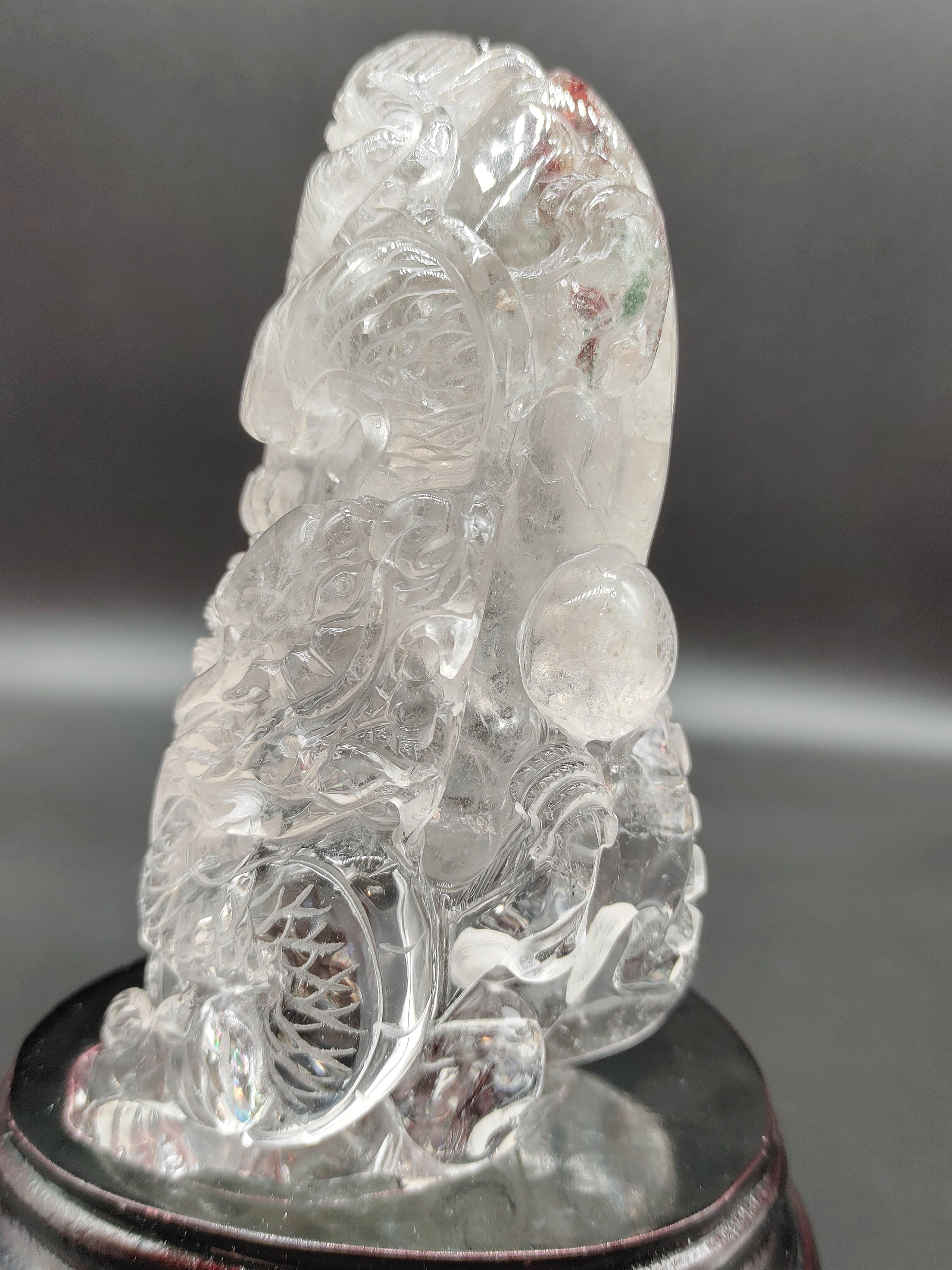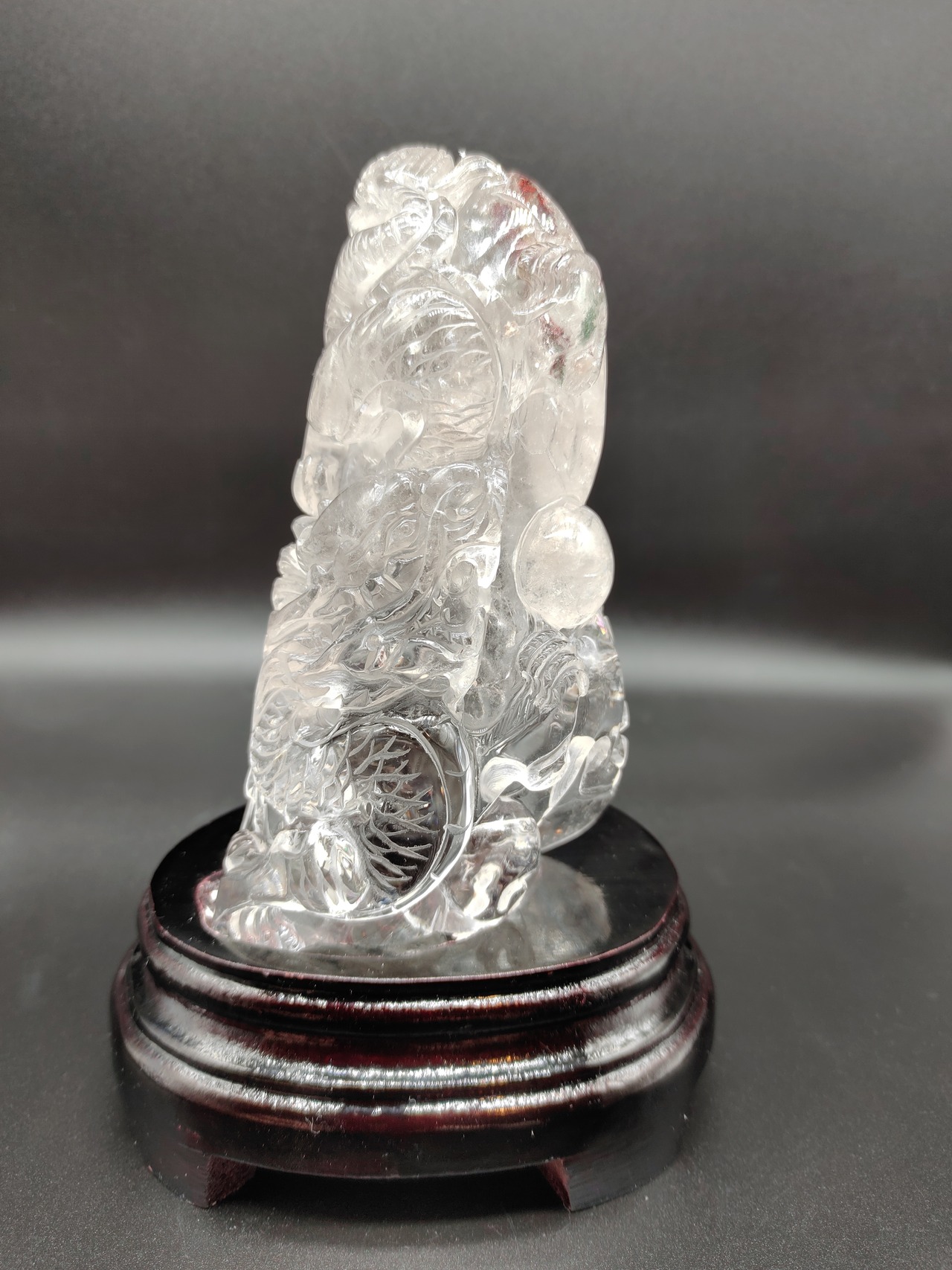 勢いの良い昇龍がインパクトの、開運昇龍水晶彫刻です。品のいい大きさで、事業者様だけでなく、家屋の玄関やリビングにも違和感なく置いて頂けます。